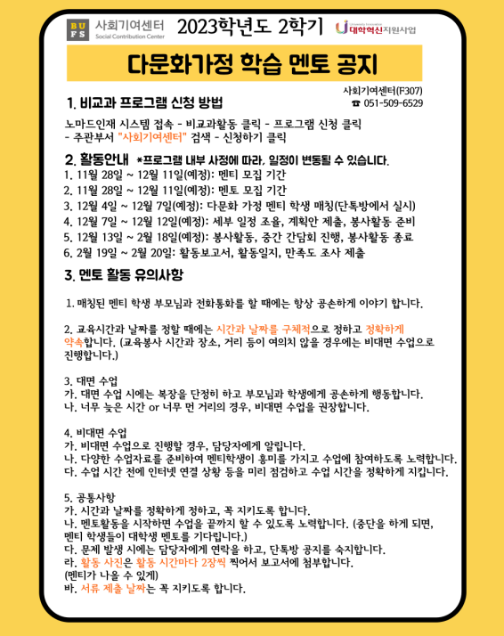 사회기여센터 에서 2023학년도 2학기 다문화가정지원프로그램 공지가 있어 안내드립니다.