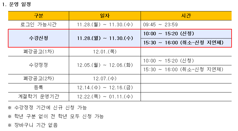 11월28일부터 우리대학 계절학기 신청기간입니다.