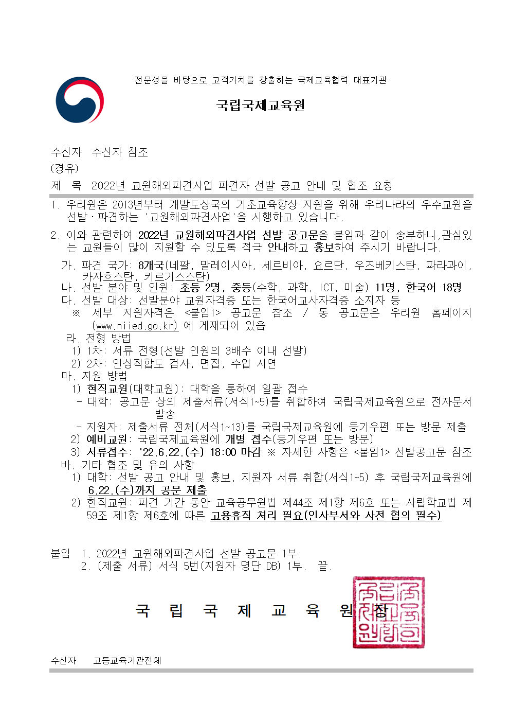 파견국가부터 지원 방법까지 해당 공문내용에 나와있으니, 관심 있으신 분께서는 참고해주시길 바랍니다.