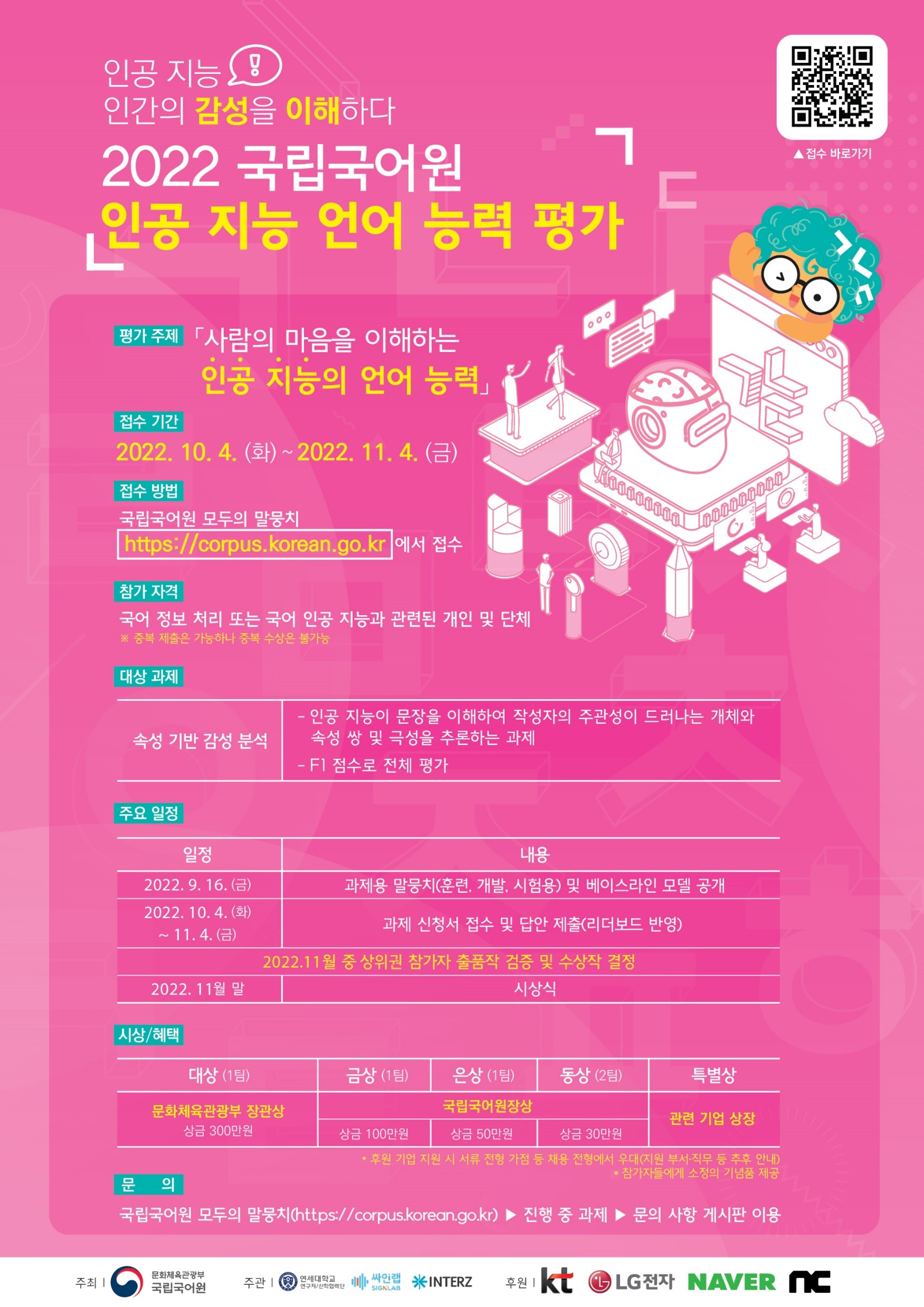 국립국어원이 ‘2022 국립국어원 인공 지능 언어 능력 평가’ 대회를 개최합니다. 올해 대회의 주제는 ‘사람의 마음을 이해하는 인공 지능의 언어 능력’이며